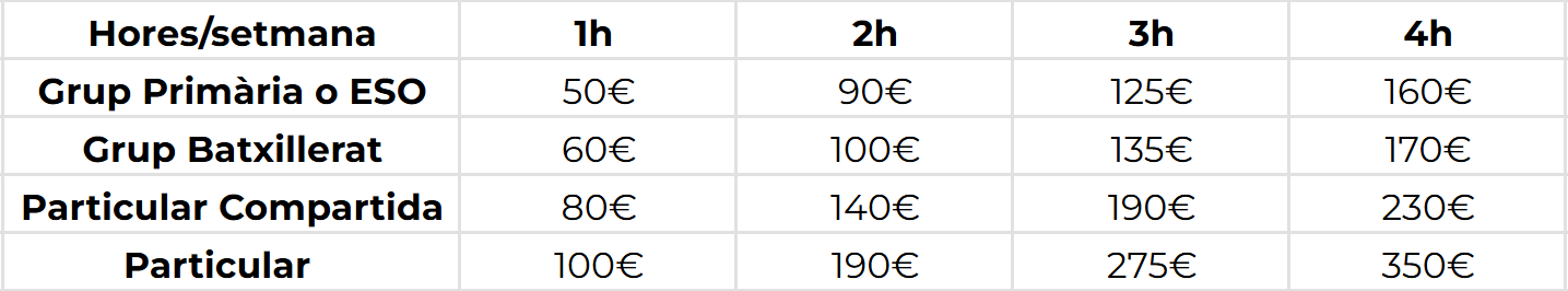 Pagament: La mensualitat es paga per anticipat, mitjançant domiciliació bancària o en efectiu abans del dia 10 de cada mes.